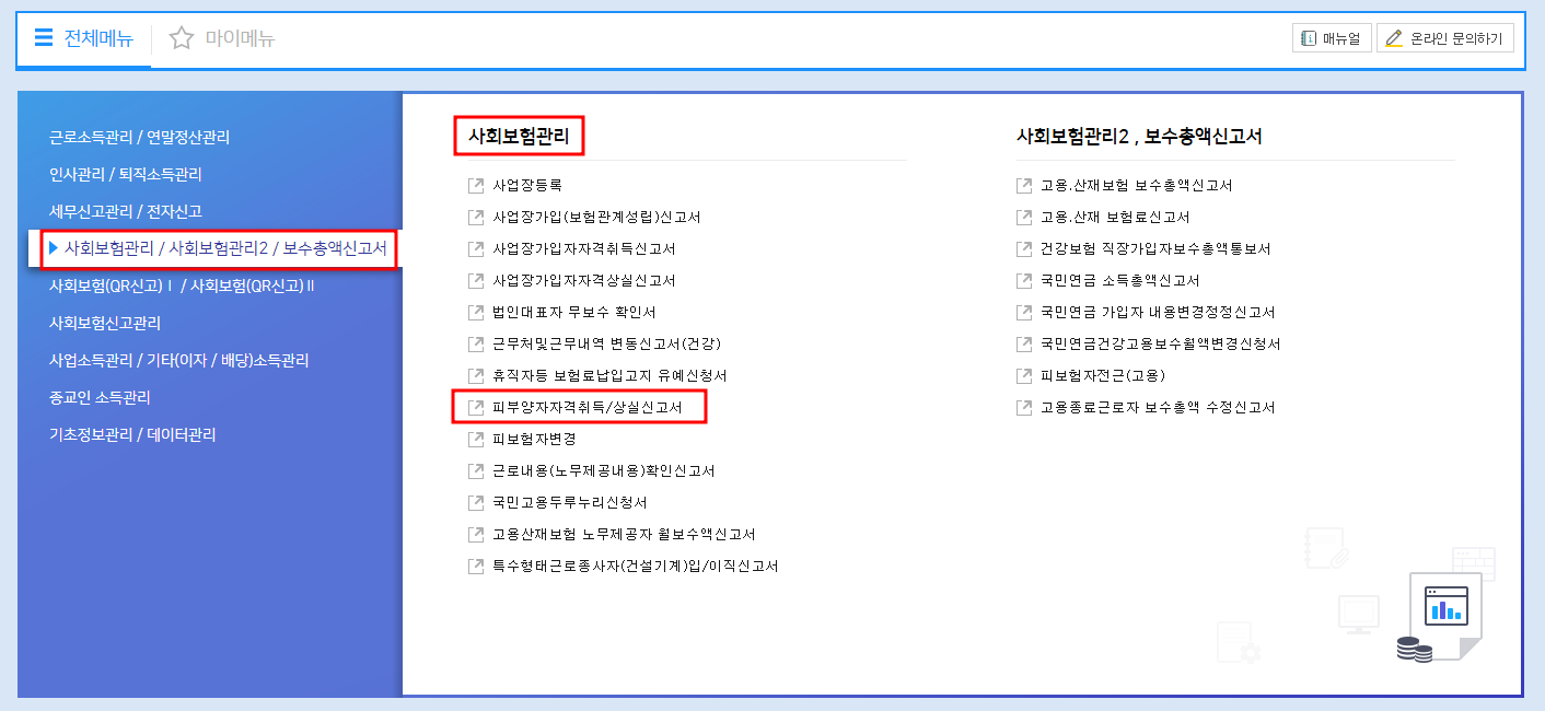 먼저 급여 페이지에서 사회보험관리 카테고리를 찾아 들어갑니다.