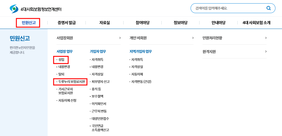 ※ 미가입 사업장 : 사업장 업무 > 성립신고 (두루누리보험료지원 체크)