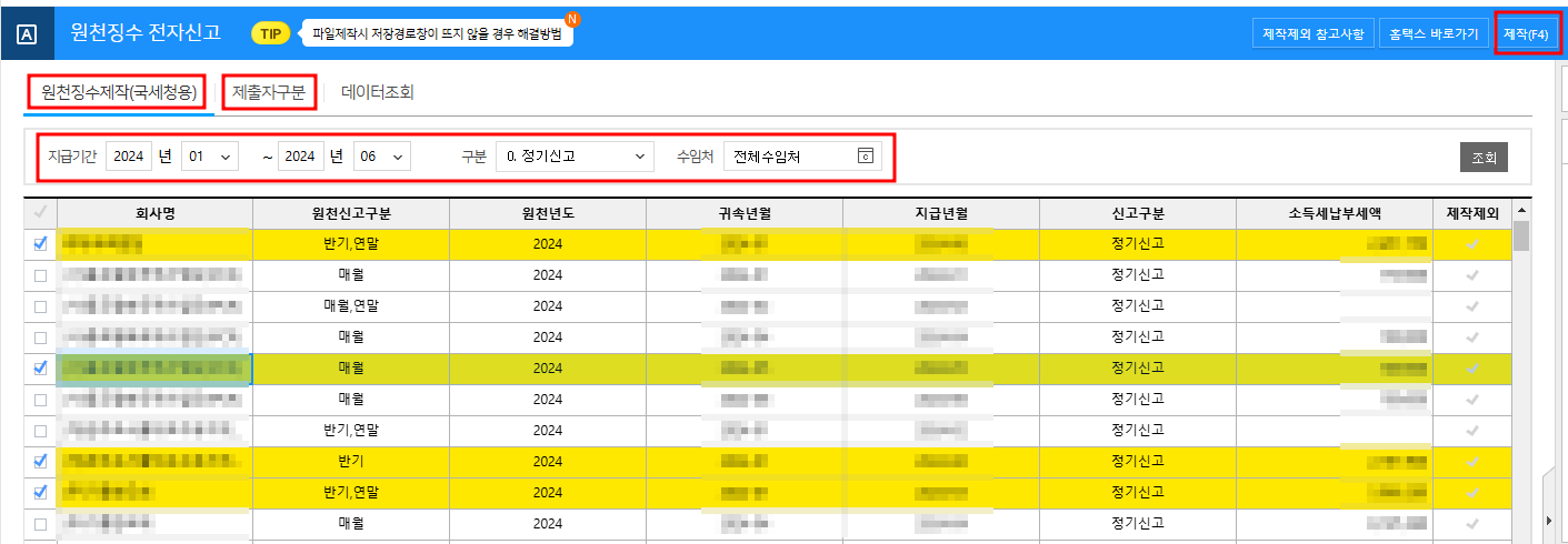 여기서 의무구분이 "매월" 이라면, 매월 10일까지 매 달 신고를 진행해야 합니다. 이런 경우 매 달 반복적으로 원천세 신고를 진행해야 하는데, 솔직히 깜박할 수도 있고 귀찮게 느껴지기도 해서 반기(6개월)로 변경하는게 관리자로서는 편합니다.