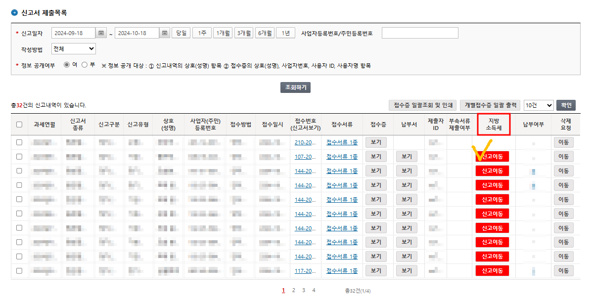 홈택스에서 원천세 신고 진행 후, 신고조회 페이지로 넘어가면 아래와 같이 신고 내역들이 모두 조회될 것입니다. 이때 위와 같이 빨간색으로 활성화 되어있는 "지방소득세 신고 이동" 버튼을 누르면, 해당 상호(거래처)별로 각각 지방세 신고를 진행할 수 있습니다.